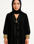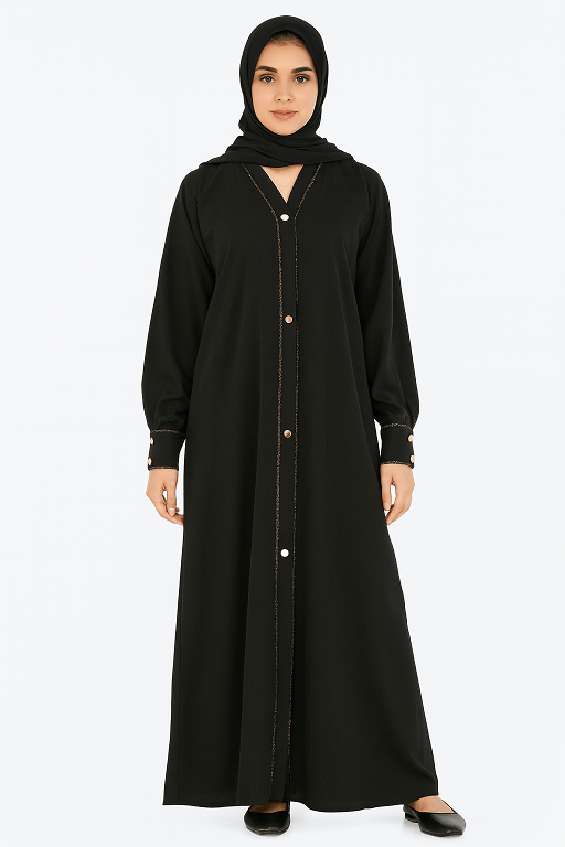 RINEZZA Abaya Black Long Sleeve Button Front with Gold Trim Detail with Plain Black Dupatta