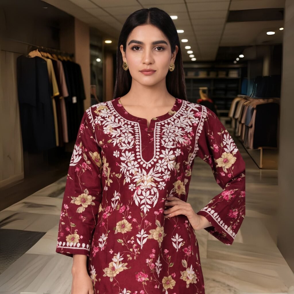Rinezza Floral Embroidered Lucknowi Chikankari Kurti | with White Neckline | 3/4 Sleeves | Straight Top Short Kurti