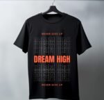 Make a bold statement with this striking black unisex t-shirt featuring an eye-catching ‘Dream High’ motivational design.