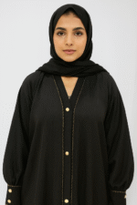 Be the first to review “RINEZZA Abaya Black Long Sleeve Button Front with Gold Trim Detail with Plain Black Dupatta” Cancel reply