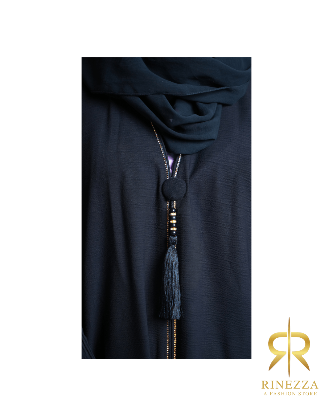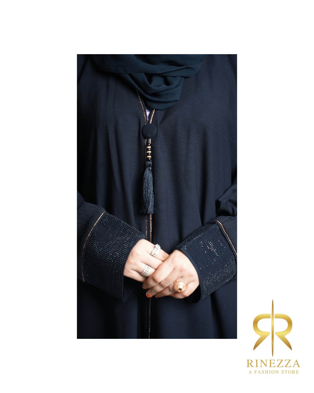 RinezzaElegant Black Abaya with Tassel Detail, Crystal Embellished Sleeves, Dubai Style, Free Size with Dupatta