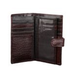 - The wallet’s premium construction showcases a secure button closure and ample space for currency notes.
