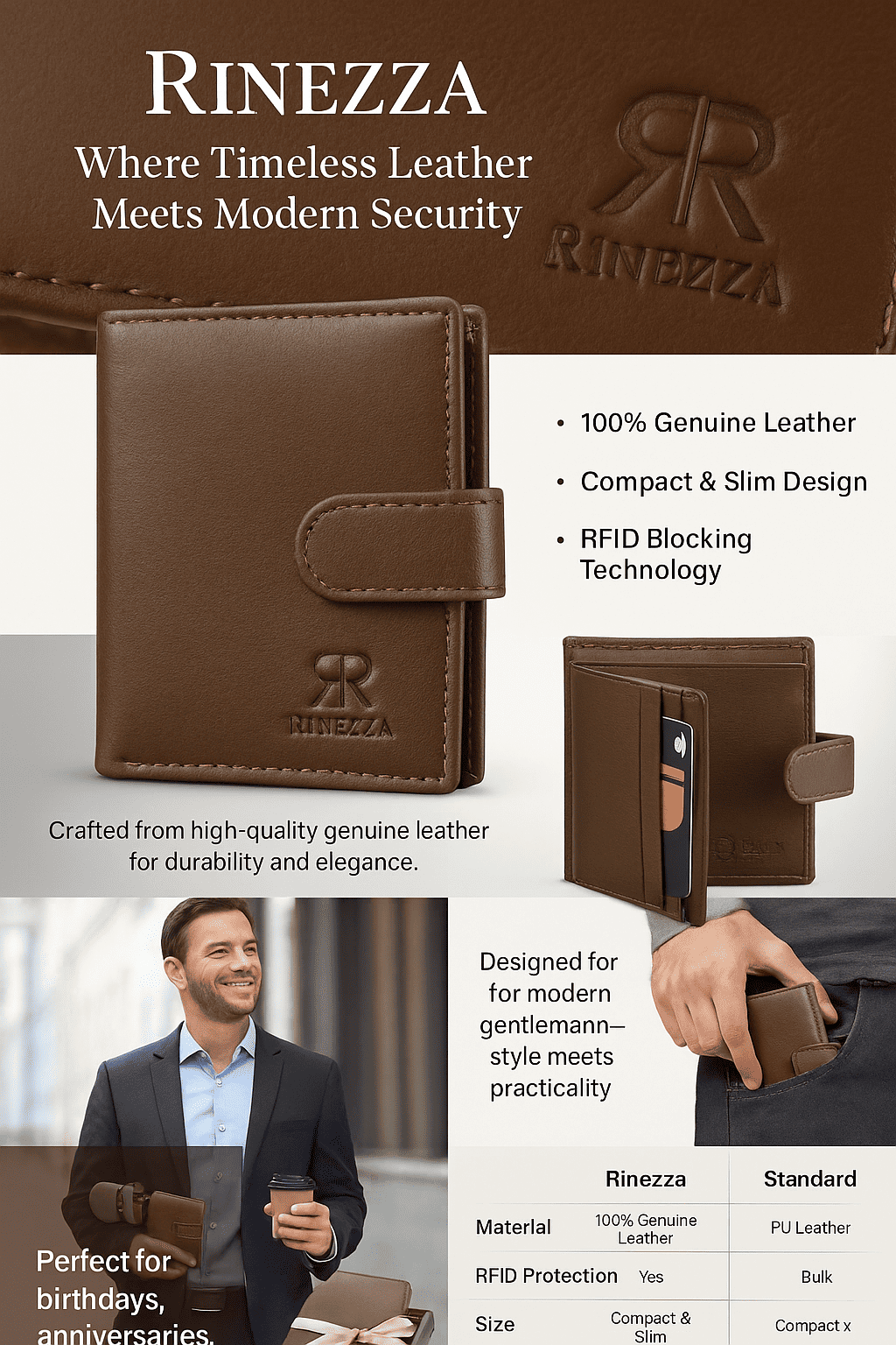Rinezza Genuine Leather RFID Wallet for Men | Slim Card Holder | Compact Bi-Fold with Snap Closure | Multiple Card Slots & Cash Compartment