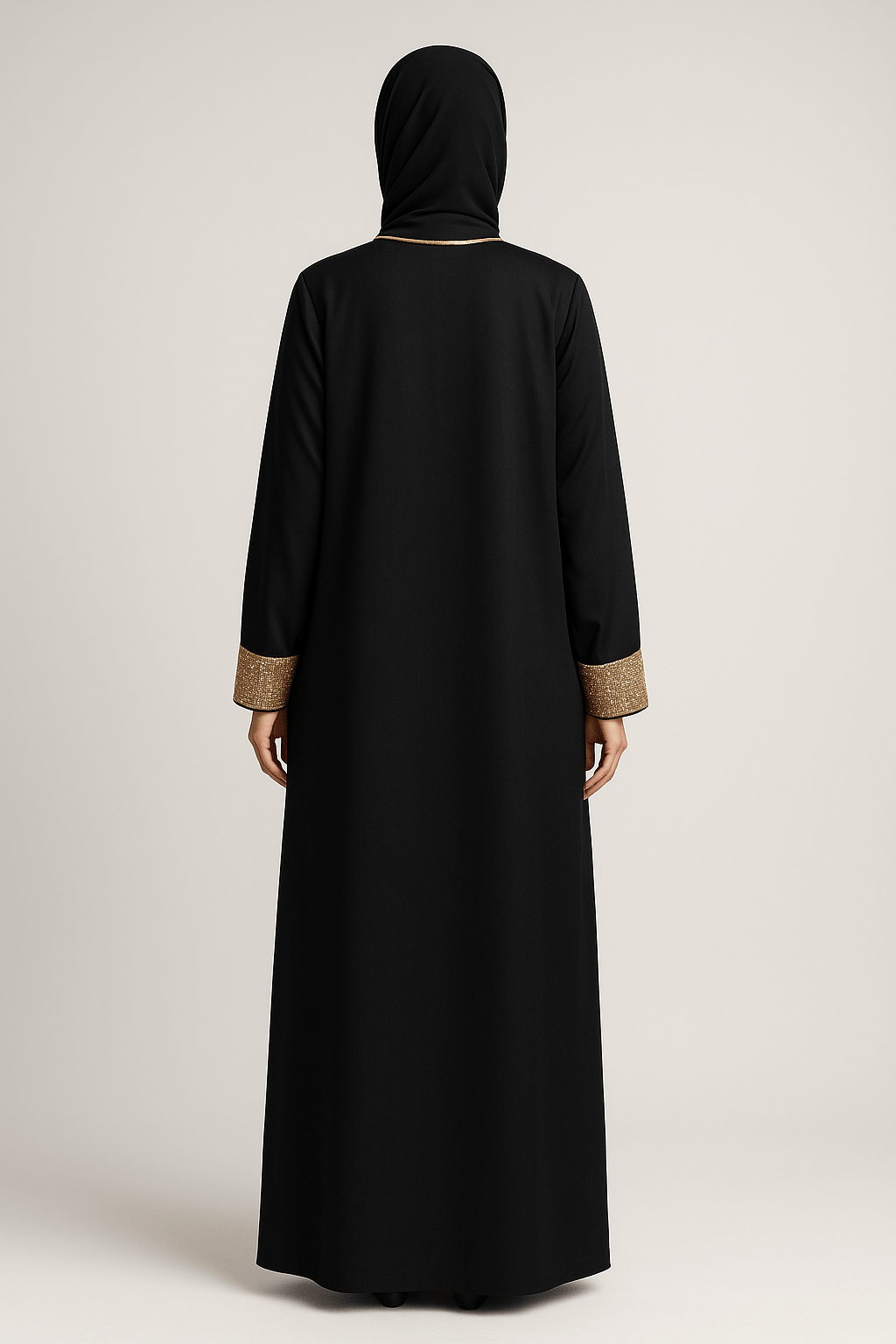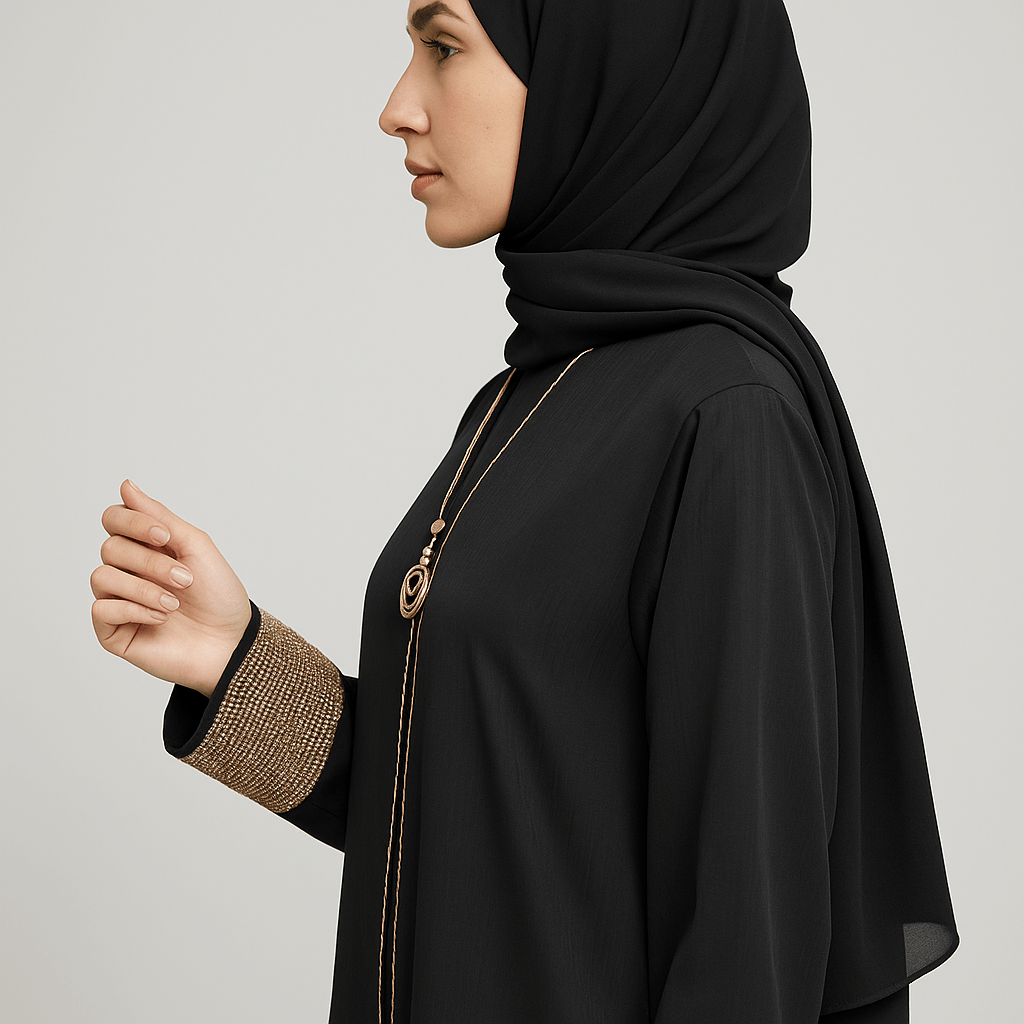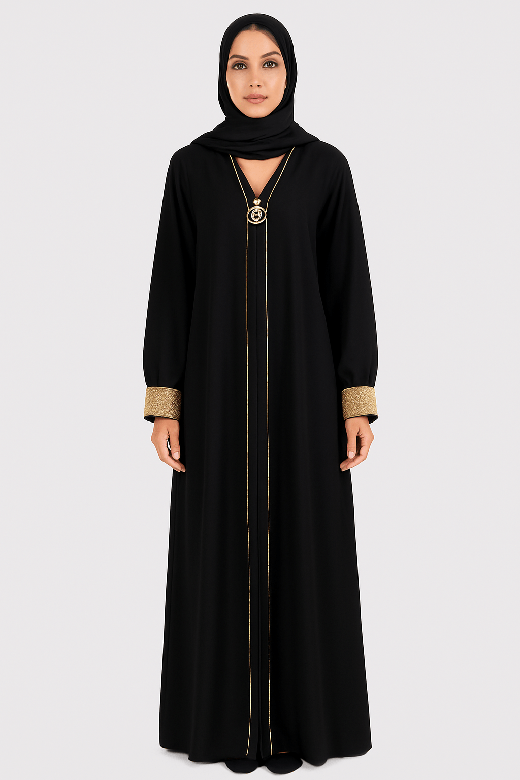 - Elegant Design: Modern black abaya featuring gold-tone accents, decorative pendant detail, and luxurious embellished cuffs for a sophisticated look.