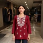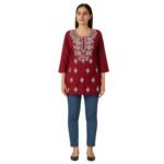 • Design: Elegant Lucknowi embroidered kurti featuring intricate floral patterns on the neckline and scattered motifs throughout the garment