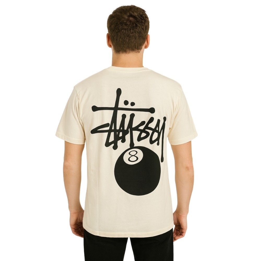 Upgrade your streetwear collection with the Stüssy 8-Ball Graphic T-Shirt for men in white. Made from 100% premium cotton, this casual tee ensures comfort, breathability, and durability for everyday wear. The front features a minimal oversized Stüssy graffiti logo, while the back showcases the iconic 8-Ball artwork paired with bold Stüssy branding, making it a true statement piece in street culture fashion.
